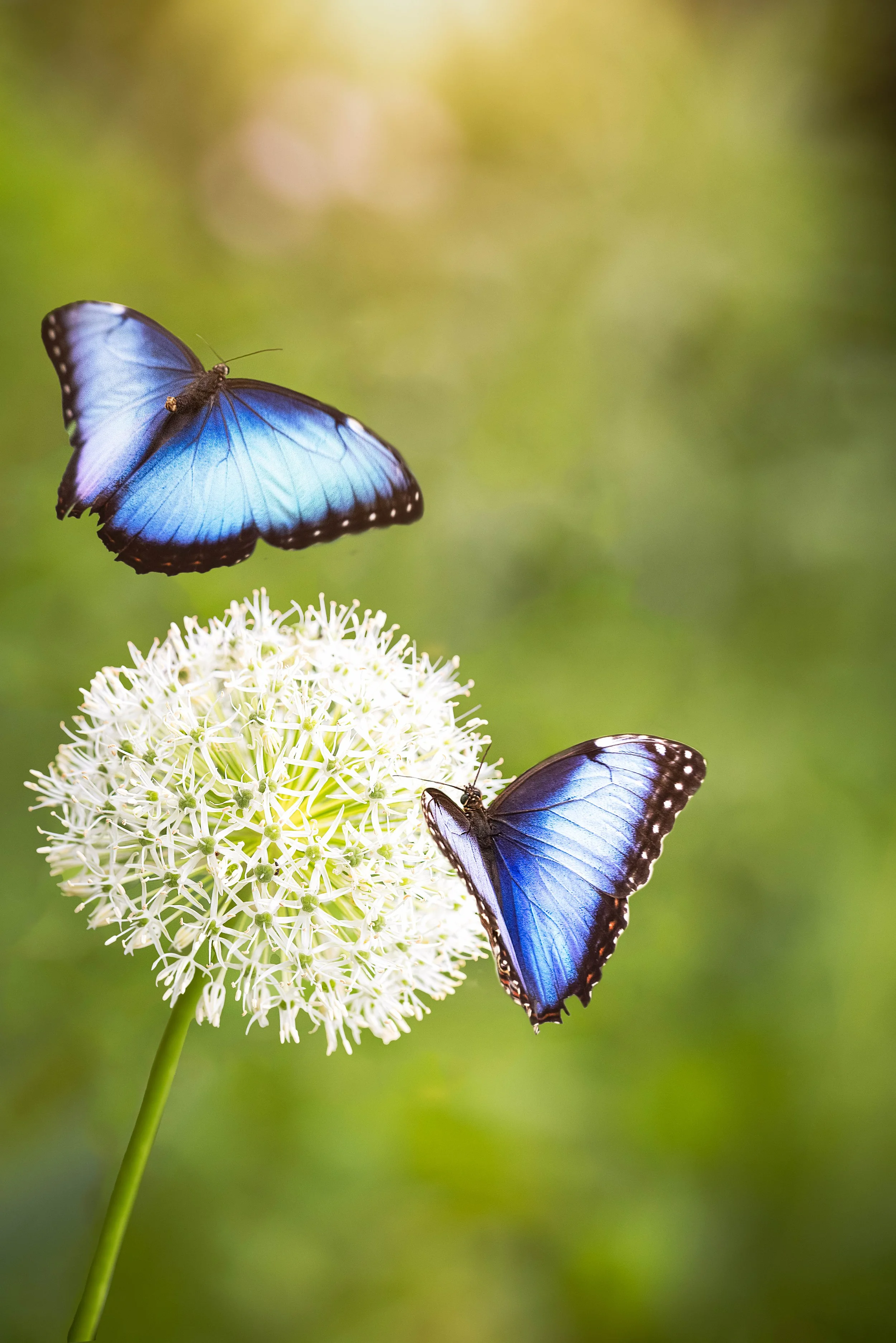 Stunning macro photography print of a blue morpho butterfly resting among floral blooms. Vivid blues and soft lavender tones make this a striking statement piece. Printed on archival-quality paper or canvas for lasting color and detail.
