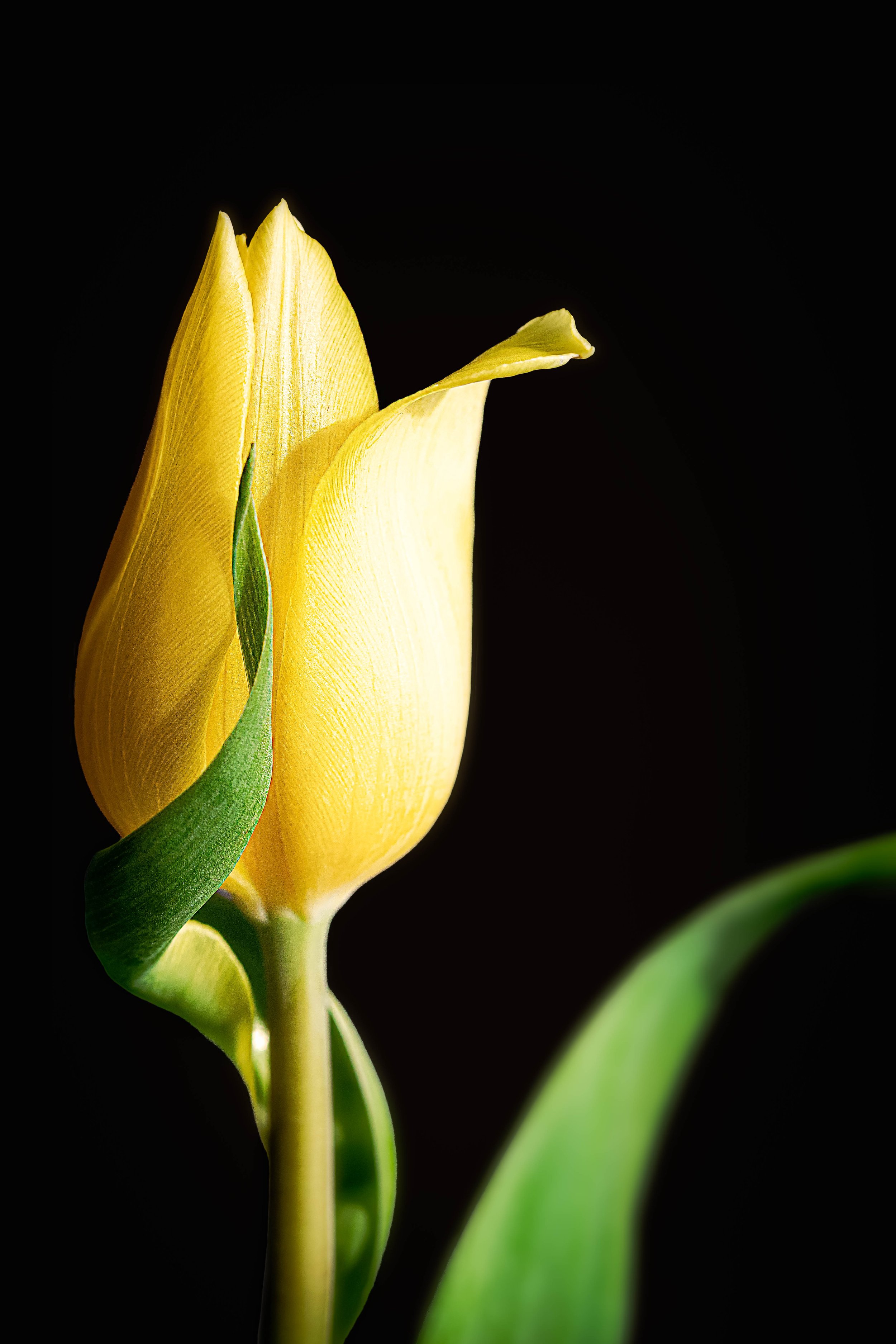 Luminous fine art macro print of a yellow tulip standing against a rich black background. Warm golden petals and clean composition make this a bright, modern botanical statement piece. Printed on museum-quality archival paper, metal or canvas.